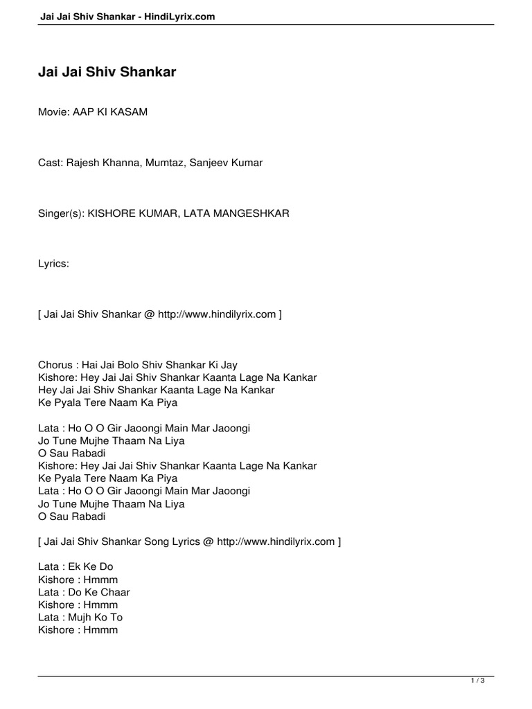 Jai Jai Shiv Shankar Lyrics In Hindi : Hey jai jai lata :